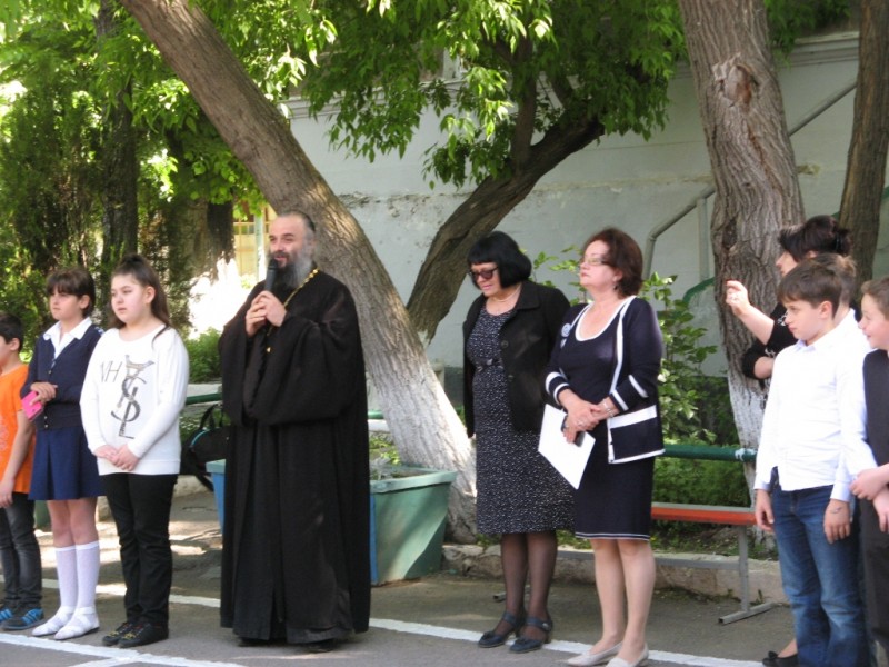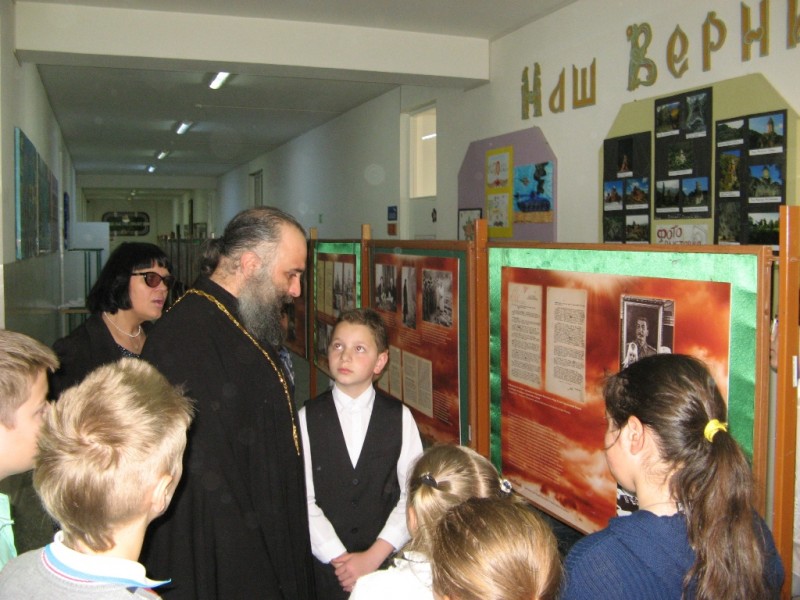 Сегодня в школе открылась выставка, организованная Русской Православной Церковью, посвященная вкладу РПЦ в Великую Победу нашего народа над фашизмом. На торжественной линейке перед учащимися выступил Благочинный Ереванского церковного округа протоиерей Арсений Григорянц.Ученики 5-11-х классов внимательно и с интересом прослушали рассказ о трудностях и лишениях,выпавших на долю церковных деятелей в годы становления Советской власти, о той роли,которую сыграла церковь в годы Великой Отечественной войны 1941-1945 г.