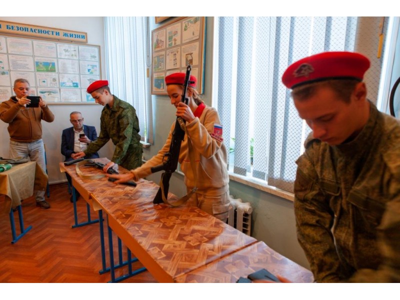 Затем в кабинете основ безопасности жизнедеятельности под руководством учителя ОБЖ юнармейцы продемонстрировали своё умение в неполной разборке и сборке автомата Калашникова и рассказали о гранатах и минах, состоящих на вооружении в российской армии.
