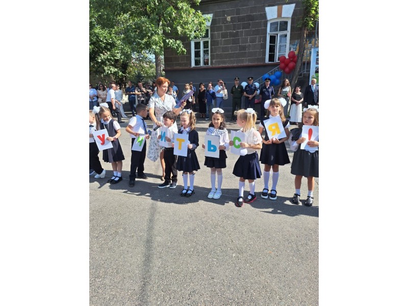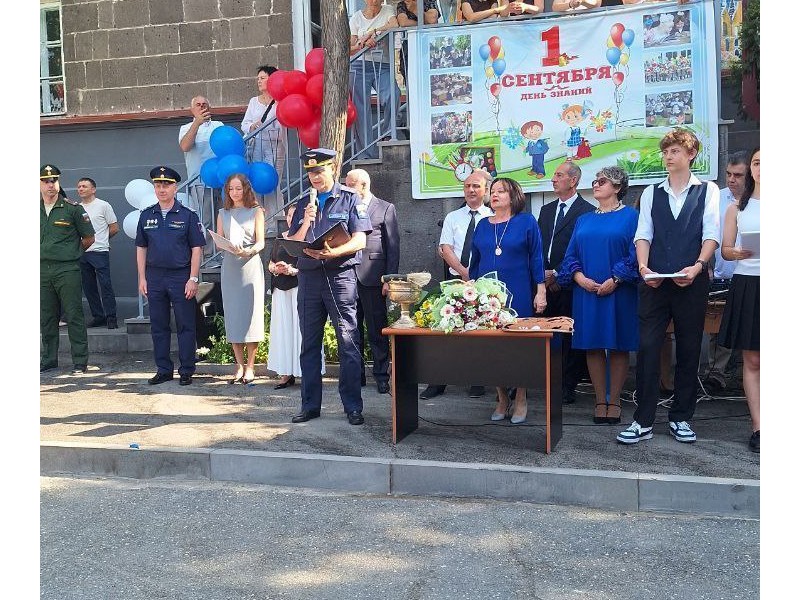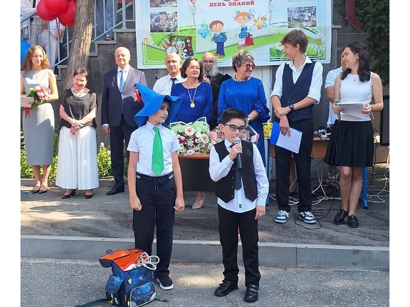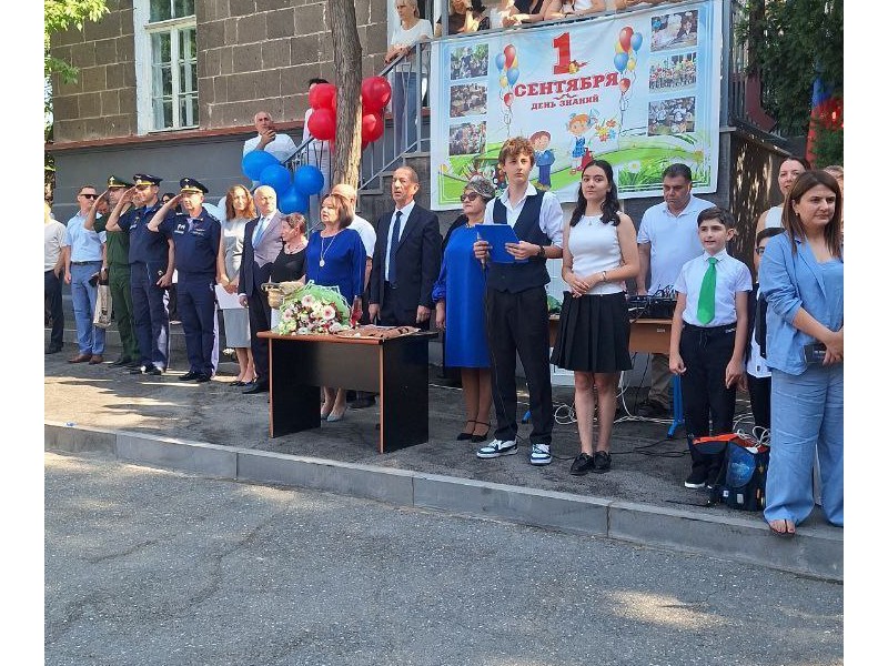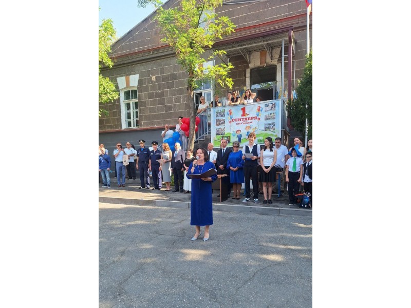 С напутственными словами в адрес собравшихся обратилась директор С.Д.Хачатурян. Поздравить ребят с Днём знаний смогли также почётные гости праздника- Чрезвыйчайный и Полномочный посол РФ в РА С.П.Копыркин, заместитель командира российской авиабазы по военно-политической работе подполковник Д.С.Шаршов, представитель Россотрудничества в РА Айгуль Шамсутдинова, настоятель РПЦ Отец Арсений, благословивший и окропивший ребят на хорошую учёбу.